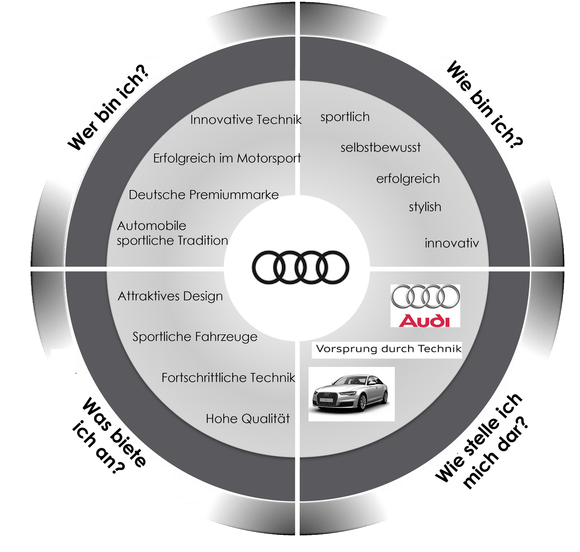 Das Markensteurrad bildet die folgenden Komponenten der Marke ab: