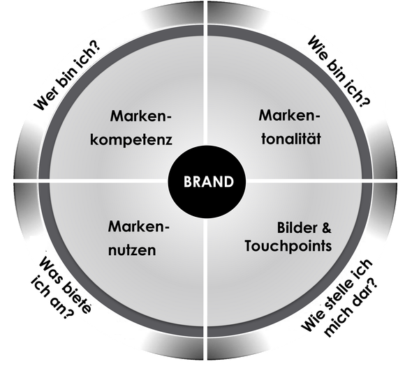 Das Markensteurrad bildet die folgenden Komponenten der Marke ab: