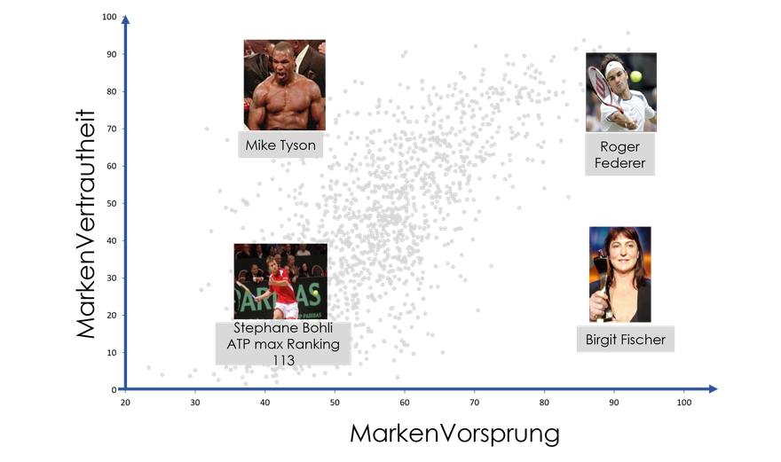 Auch Personen können über die Markmetrics Datenbank "gebenchmarkt" werden. Zur Veranschaulichung der unterschiedlichen Positionierungen sind hier verschiedene Sportler dargestellt.