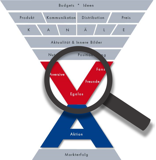 Das Markmetrics Gesamtmodell stellt ein holistisches Instrument zur erfolgreichen Markenführung dar, das auf allen Ebenen des Prozesses ansetzt. Es enthält unter anderem das Markmetrics V-System.
