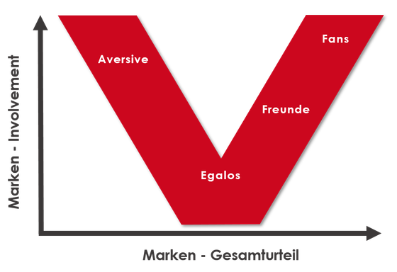 Das V-System ist eine holistische Markenstärkemessung und ein zuverlässiger Indikator für Markterfolg. Es misst den MarkenVorsprung, die Gesamteinstellung zur Marke. Es ergeben sich 4 Beziehungen, die Menschen zu einer Marke haben können: